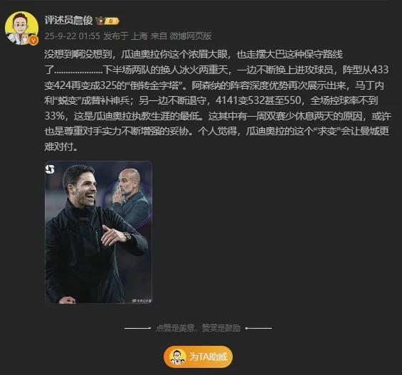 对于瓜帅在本场比赛做出的战术选择,詹俊老师赛后在社媒做出点评,可谓是一针见血。