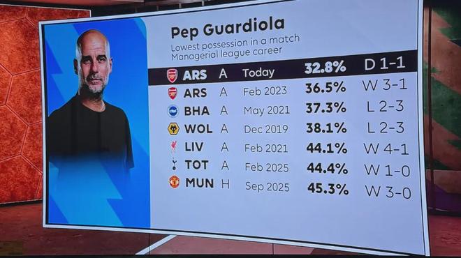 第76分钟,瓜帅撤下哈兰德,换上防守型中场尼科·冈萨雷斯,阵型变成5-5-0——活脱脱一份穆里尼奥式作业。 全场曼城控球仅32.8%,这是瓜帅执教601场联赛以来的最低值。
